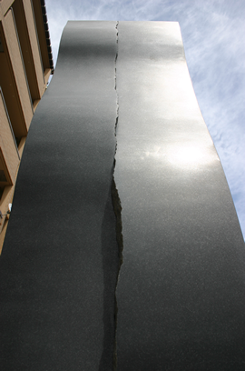 最初に大きな黒御影石の塊を二つに割る。それを別々に加工してから割った面に合わせて元に戻す。こうすることで、一つの石の中に別々の波長の波が共存することになる。作品の主題となっている柔らかい曲面と両側や天板のシャープな平面や、二つの波の間から見える荒々しい割り肌と研磨された滑らかな面といった、異質なものが一体化して調和した様子は、理想的なまちづくりの姿に喩えられるだろう。